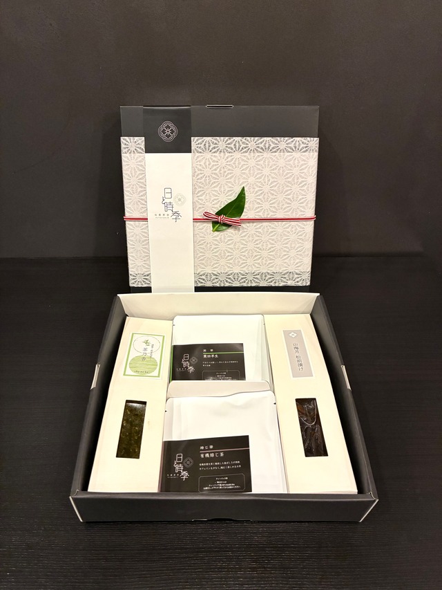 当店カフェで人気の香の物、山海月松前漬けと茶乃香(煎茶の佃煮)に 4種の日本茶(栗田早生、あさつゆ、屋久島紅茶、有機ほうじ茶)をセットにした バラエティーあふれる詰め合わせセット。 大切な方への手土産、返礼品にどうぞ!! <配送方法> クール便 <保存方法> 冷蔵庫(4℃)にて保存 <賞味期限> 漬物:製造日より20日間 商品到着後はお早めにお召し上がりください。 内容量 山海月松前漬け、茶乃香(お茶佃煮) 栗田早生(ティーバッグ4gが2個入り)、あさつゆ(ティーバッグ4gが2個入り) 有機焙じ茶(ティーバッグ4gが2個入り)、屋久島紅茶(ティーバッグ4gが2個入り)